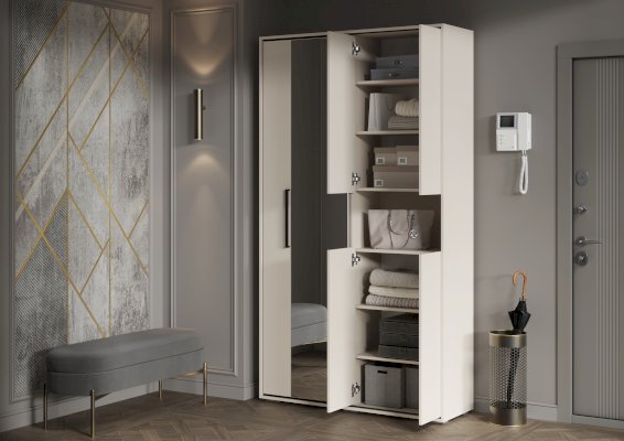 Разделение на секции: Одна часть прихожей включает две одинаковые секции с полками, закрытые створками. В каждой секции предусмотрено по две съёмные полки, что позволяет настраивать пространство под ваши нужды. Открывание створок осуществляется за выступ, что делает использование шкафа более удобным.