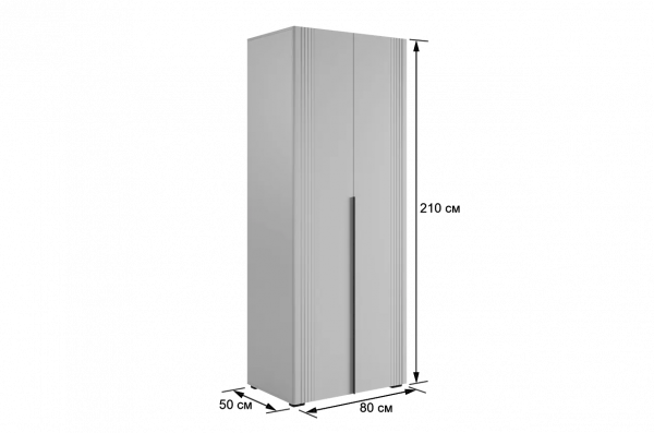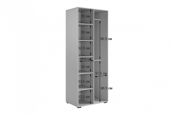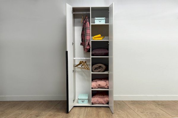 Шкаф оснащён длинными пластиковыми ручками и имеет удобное внутреннее наполнение: слева расположены полки, а справа — две штанги для вешалок. Это позволяет рационально использовать пространство и разместить различные типы одежды.