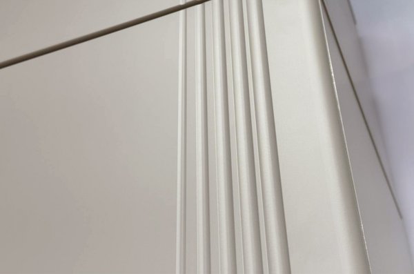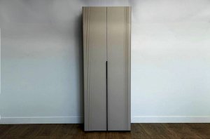 Корпус шкафа изготовлен из ЛДСП, что гарантирует прочность и долговечность. Фасад, покрытый МДФ в плёнке ПВХ, не только выглядит эстетично, но и защищает шкаф от повреждений. Особое внимание заслуживает фрезеровка фасадов, которая придаёт шкафу изысканный вид.